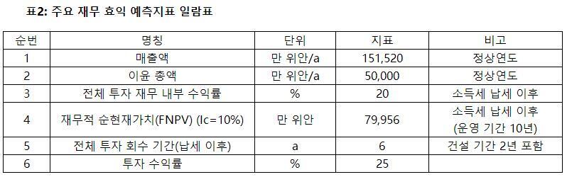 프로젝트 생산 목표 달성 시, 연평균 매출액 151,520만 위안, 이윤 50,000만 위안, 투자회수기 6년(납세 이후, 건설 기간 2년 포함), 투자 수익률 25%.