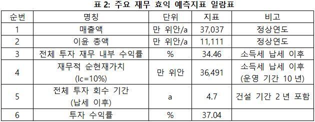 프로젝트가 설계 생산 능력의 생산량에 도달한 후 연간 매출액 37,037만 위안, 이윤 11,111만 위안, 투자 회수 기간 4.7년(납세 이후, 건설 기간 2년 포함), 투자 수익률은 37.04%이다.
