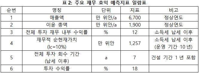 프로젝트가 설계 생산 능력의 생산량에 도달한 후 연간 매출액 6,700만 위안, 이윤 1,900만 위안, 투자 회수 기간 7년(납세 이후, 건설 기간 1년 포함), 투자 수익률은 18%이다.