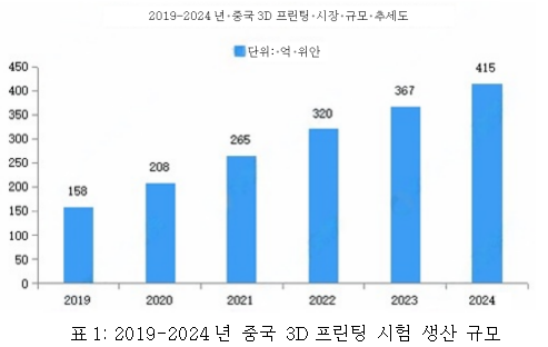 최근 몇 년간 3D프린팅 제품의 점진적인 규모화 응용과 일부 누적된 3D프린팅 장비 수요 해소의 견인으로 시장 규모가 지속적으로 성장하고 있다. 2022년 중국 3D프린팅 시장 규모는 약 320억 위안으로 전년 대비 동기 20.75%성장했으며, 2023년 시장 규모는 367억 위안에 달했다. 2024년 시장 규모는 415억 위안에 달했다.