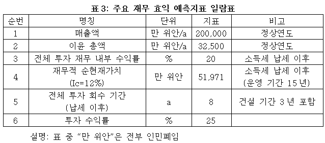 프로젝트가 설계 생산 능력의 생산량에 도달한 후 연간 매출액 200,000만 위안, 이윤 32,500만 위안, 투자 회수 기간 8년(납세 이후, 건설 기간 3년 포함), 투자 수익률은 25%이다.