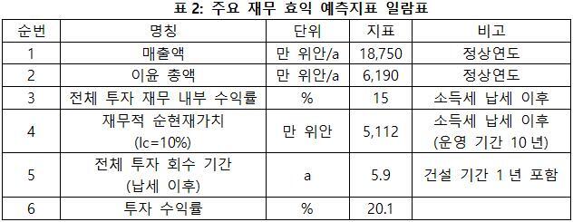 프로젝트가 설계 생산 능력의 생산량에 도달한 후 연간 매출액 18,750만 위안, 이윤 6,190만 위안, 투자 회수 기간 5.9년(납세 이후, 건설 기간 1년 포함), 투자 수익률은 20.1%이다.