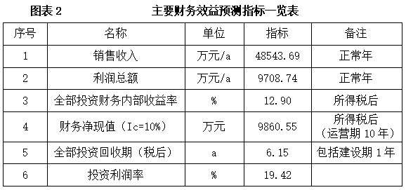 项目达产后,年销售收入48543.69万元,利润9708.74万元,投资回收期6.15年(税后,含建设期1年),投资利润率19.42%。