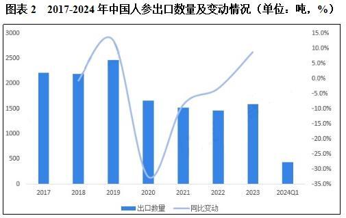 2019-2021年,受疫情影响我国人参出口数量不断下跌,2021年达到近年来低谷。2022年以来,出口不断回暖,到2023年达到2070吨,同比增长44%。人参出口金额整体呈现W型走势。2021年为近年来低谷,出口金额仅24万美元。2022-2023年出口金额不断回升,到2023年超过160万美元,同比增长46%,回升至2017年水平。从出口目的地来看,2023年,我国人参出口主要目的地为日本,占比超过40%,其次为中国香港与中国台湾,占比分别为23.8%与16.9%,其他地区占比不足5%。从出口均价方面,2017-2023年人参出口均价在0.5-0.8美元/千克区间波动。2022年出口均价小幅上涨,2023年为0.85美元/千克,但总体来看相对稳定。总体来看,我国人参出口呈现数量先降后增,2023年有回暖趋势,从出口标的来看,我国约40%的人参出口至日本,且出口均价相对稳定。从长期来看,随着国内企业对于人参消费品的研发,对外出口人参产品品类的附加价值的不断提升,有望拉大我国人参出口数量以及出口金额。