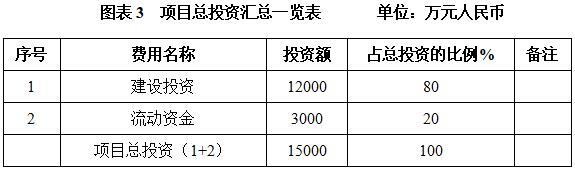本项目总投资为15000万元,其中:建设投资12000万元,流动资金3000万元。