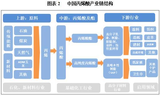 中国丙烯酸行业上游是原料,用于制作丙烯。其中分为石油等传统能源提炼的丙烯和生物基例如ADM玉米提炼的丙烯。中游是丙烯酸以及酯,其中丙烯酸酯的下游对应的是高分子乳液、树脂等,终端应用是涂料、纺织等行业;高纯度丙烯酸下游对应的是SAP,终端领域是个护卫生用品。