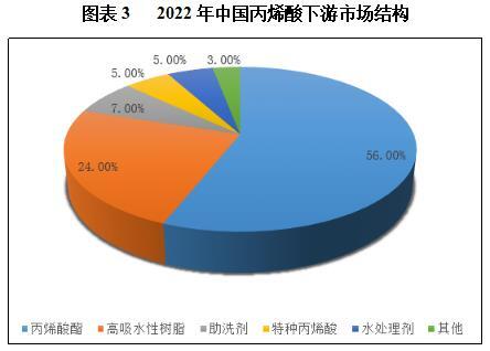 丙烯酸化学性质活泼,在空气中易聚合,加氢可还原成丙酸,与氯化氢加成生成2-氯丙酸,主要用于制备丙烯酸酯。根据数据,2022年我国丙烯酸下游市场中丙烯酸酯占比超50%。其次是高吸水性树脂,占比达24%。