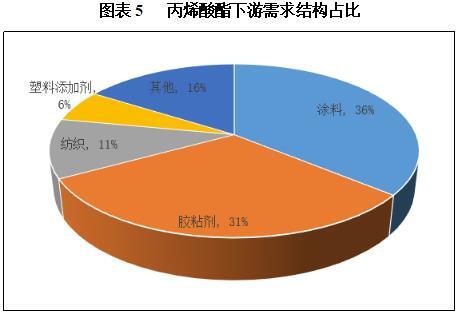 丙烯酸酯用于生产涂料产品的比重为36%,用于胶粘剂产品的比重为31%,两者是丙烯酸酯最主要的下游产品,合计占比超过65%。