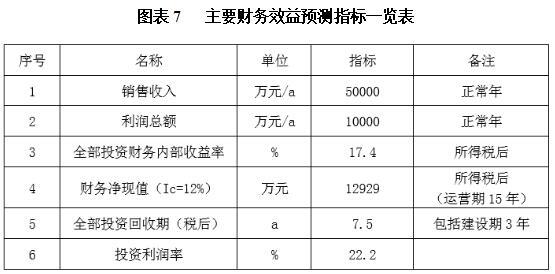 项目达产后,年销售收入50000万元,利润10000万元,投资回收期7.5年(税后,含建设期3年),投资利润率22.2%。