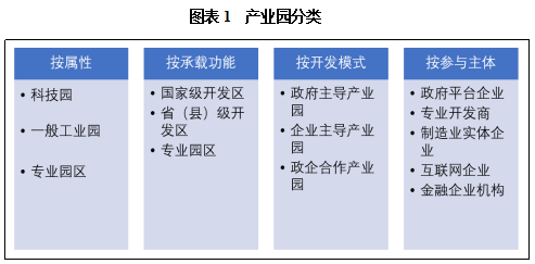 产业园区按属性可大体上分为科技园、一般工业园、专业园三大类;按承载功能可分为国家级开发区、省级开发区和各类专业园区;按开发模式可分为政府主导、企业主导、政企合作开发产业园三种;而按开发建设参与主体,可大致分为政府平台企业、专业开发商、制造实体企业、互联网企业及金融机构开发建设的产业园。