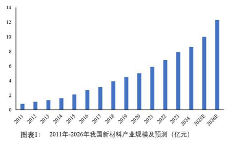 作为战略性、基础性产业,新材料产业已成为国内外高技术竞争的关键领域。目前,作为全球第二梯队的“领头羊”,我国新材料产业产值占全球的比重约为1/4。2010—2022年,我国新材料产业规模从0.65万亿元增加到6.8万亿元,年均复合增长率为21.6%。2023年,全球、我国新材料产业规模分别达到4.3万亿美元、7.9万亿元人民币,同比分别增长13%、16%。预计到2025年,全球、我国新材料产业规模将分别达到5.6万亿美元、10万亿元人民币;到2026年,全球、我国新材料产业规模将分别达到6.4万亿美元、12.3万亿元人民币,同比增速均超过10%。