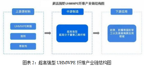 超高强型UHMWPE纤维产业链可以分为上游的超高分子量聚乙烯(UHMWPE)树脂、溶剂、萃取剂等,中游的超高强型UHMWPE纤维生产,以及下游的防弹、防爆等国防军工以及高端绳索应用领域三大环节。其具体产业链结构如下: