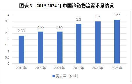 冷链物流联系着现代农业、食品加工、医药产品等的生产端和消费端,是延伸产业链、打造供应链、提升价值链的重要支撑。近年来,在政策支持以及下游行业不断发展的背景下,中国冷链物流需求总量持续扩大。2023年中国冷链物流市场整体处于承压前行、需求逐步企稳回升的震荡发展局面,冷链物流需求总量约3.50亿吨,同比增长6.1%。2024年中国冷链物流总需求量达到3.65亿吨。
