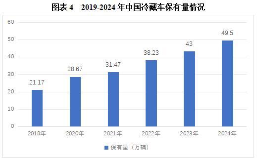 得益于冷链物流需求的增长以及新能源冷藏车技术的推广和应用,我国冷藏车保有量呈现出稳步增长的态势。2023年,全国冷藏车市场保有量达到43.20万辆,较上年增长4.97万辆,同比增长12.9%,2024年中国冷藏车保有量将达到49.5万辆,同比增长14.58%。