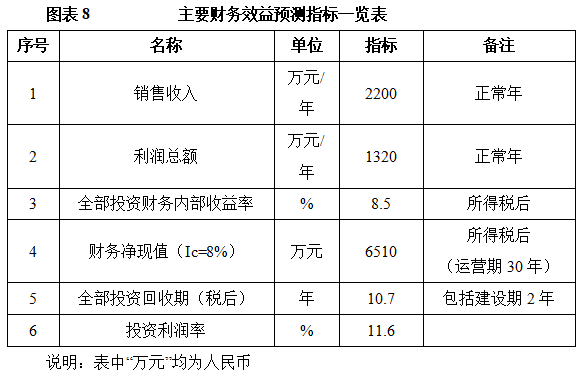 项目达产后,年销售收入2200万元,利润1320万元,投资回收期10.7年(税后,含建设期2年),投资利润率11.6%。