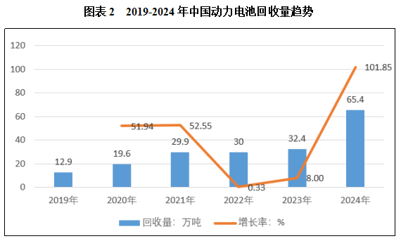随着动力电池的集中退役,中国动力电池回收行业开始进入发展期。数据显示,2019年至2022年,中国动力电池实际回收量由12.9万吨上涨至30万吨,2023年达到32.4万吨。2024年动力电池实际回收量为65.4万吨。