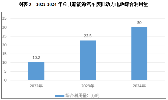 2023年全年新能源汽车废旧动力电池的综合利用量已达到22.5万吨,同比增长了121%。根据工信部相关数据,提出,2024年退役动力电池综合利用量突破30万吨,同比增长约33%。