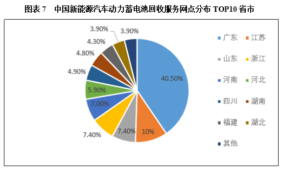 工信部认定的新能源汽车动力蓄电池回收服务网点共有15446个,电池回收利用体系初步建立。从区域分布来看,回收服务网点主要集中在东部地区。广东、江苏、山东、浙江回收服务网点超1000个,分别为1547个、1141个、1138个、1078个,占比分别为10.0%、7.4%、7.4%、7.0%。河南、河北、四川、湖南、福建、湖北进入前十,依次排名第5-10名。