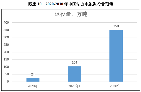 随着我国新能源汽车产业的快速发展,动力蓄电池的退役量也将逐年攀升。数据显示,2020年全国共产生退役动力电池24万吨,预测,2025年我国退役动力电池将达到104万吨,2030年预测将达到350万吨。