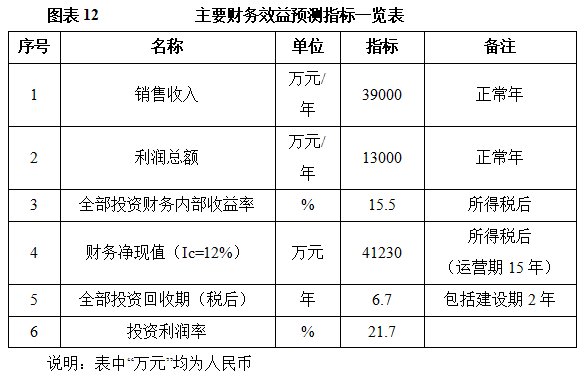 项目达产后,年销售收入39000万元,利润13000万元,投资回收期6.7年(税后,含建设期2年),投资利润率21.7%。