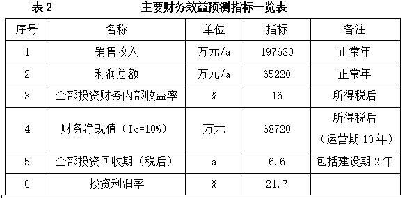 项目达产后,年销售收入197630万元,利润65220万元,投资回收期6.6年(税后,含建设期2年),投资利润率21.7%。
