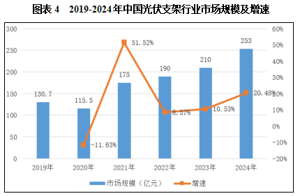 中商产业研究院发布的《2024-2029中国光伏支架市场现状研究分析与发展前景预测报告》显示,2022年中国光伏支架市场规模为190亿元,同比增长8.57%,2023年市场规模约210亿元。2024年中国光伏支架市场规模增至253亿元。随着光伏装机量不断增长,预计未来光伏支架市场将继续扩大。