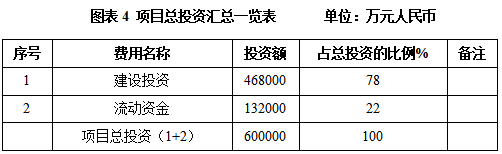 本项目总投资为600000万元,其中:建设投资468000万元,流动资金132000万元。