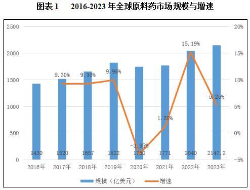 从全球范围来看,原料药市场在经历了2020年新冠疫情的冲击后逐渐恢复增长。全球原料药市场规模在2020年受新冠肺炎疫情影响与2019年相比有所下滑,从1822亿美元降至1750亿美元,下降3.95%;但很快,市场从2021年开始便恢复了增长,2022年全球原料药市场规模达到2040亿美元,2023年达到2147.2亿美元,同比增长5.25%。