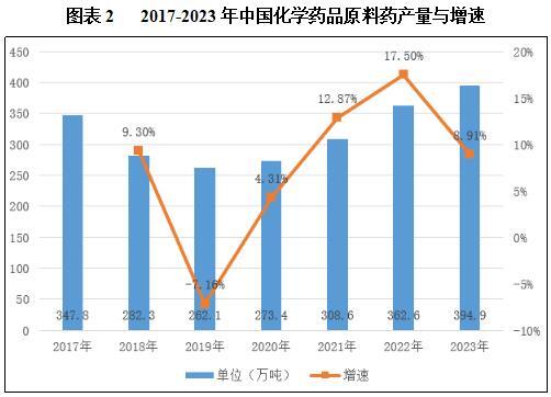 在2013-2017年间中国原料药的产能整体呈增长趋势;但在2018-2019年受环保安全监管趋严以及供给改革不断深化的影响,一些高能耗、高污染、工艺技术落后、过剩的原料药产能被淘汰,中国原料药产能下降明显;2020年,尽管全球疫情的冲击使得原料药市场增长略显迟缓,但随着我国疫情防控形势的逐步稳定以及全球经济的复苏,原料药行业迅速恢复了生机,展现出强大的发展势头。到了2023年,我国原料药产能已跃升至394.9万吨,同比增长了8.91%,这一数字不仅彰显了我国原料药产业在历经风雨后的崭新风貌,更预示着其未来巨大的发展潜力。