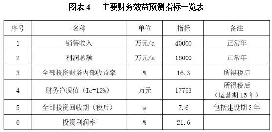 项目达产后,年销售收入40000万元,利润16000万元,投资回收期7.6年(税后,含建设期3年),投资利润率21.6%。