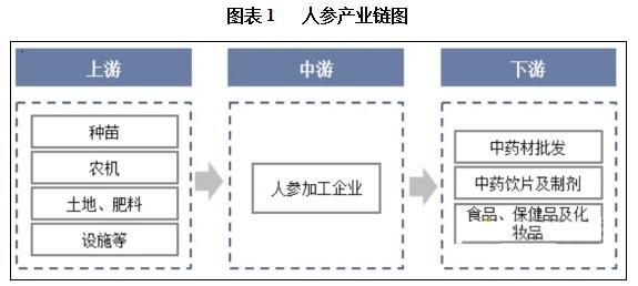 人参行业产业链上游主要为人参种植业,原材料有种苗、土地、肥料、农业机械、设施等;中游为人参加工企业,主要包括人参初加工企业及人参深加工企业;下游主要包括中药企业以及人参产品消费者两大类。