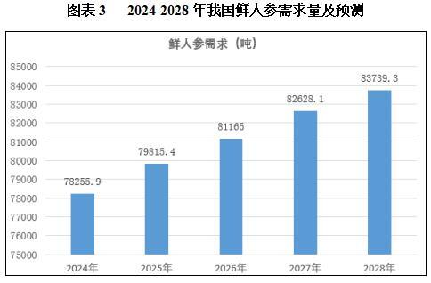 随着人参下游需求的不断多样化,市场对人参需求量将呈现增长态势,预计未来几年国内人参需求量还将呈现快速增长态势,2028年我国鲜人参需求量或将达到83739.3吨。