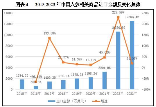 中国海关数据显示,2017年以来,中国人参相关商品总进口量波动增加,进口金额逐年增加。2022年中国人参相关商品进口量达3693.1吨,同比增长了3619.67吨,增长了49倍;进口金额达10550.39万美元,同比增长了7349万美元,增长了2倍;进口量及进口金额的增长均来自“鲜或干的西洋参”的拉动。2023年,中国人参进口量已增至5753.17吨,净进口量为3582.63吨;进口金额随贸易量同步增至12503.42万美元。