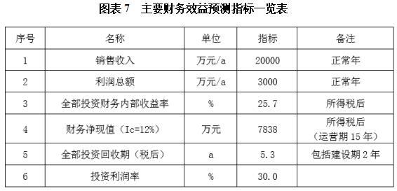 项目达产后,年销售收入20000万元,利润3000万元,投资回收期5.3年(税后,含建设期2年),投资利润率30.0%。