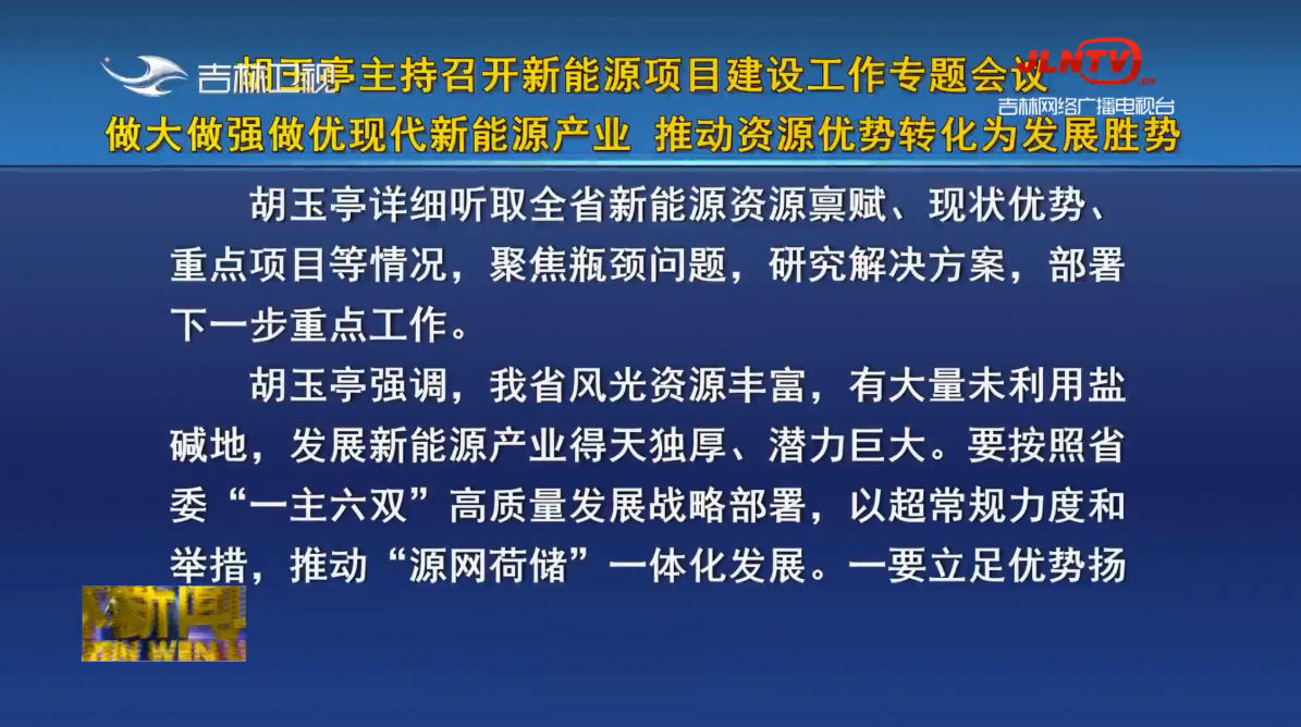 5月23日,省委副书记、省长胡玉亭主持召开省政府专题会议,研究新能源产业发展规划、项目建设、电力消纳、“吉电入京”等工作。他强调,要深入贯彻习近平总书记关于能源革命重要论述精神,按照省委部署,发挥我省风光资源优势,突出消纳能力建设,发展现代载能产业,推动资源优势转化为产业优势、发展优势、竞争优势。