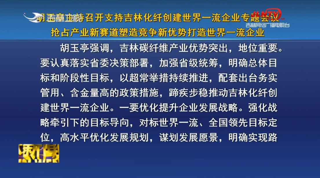 8月3日,省委副书记、省长胡玉亭主持召开支持吉林化纤创建世界一流企业专题会议。他强调,要深入贯彻习近平总书记视察吉林重要讲话重要指示精神,按照省委决策部署,立足碳纤维产业发展机遇,举全省之力推动吉林化纤集团做强做优做大,抢占新材料产业发展新赛道,为吉林全面振兴塑造新优势、培育新动能。