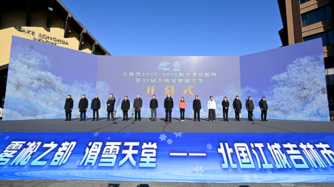 11月22日,吉林省2025-2026新雪季开板暨第31届吉林雾凇冰雪节开幕式在吉林市中旅松花湖度假区举行。省委书记黄强出席并宣布新雪季正式开板。省委副书记、省长胡玉亭为“冰雪丝路杯”粉雪联赛开赛授旗。