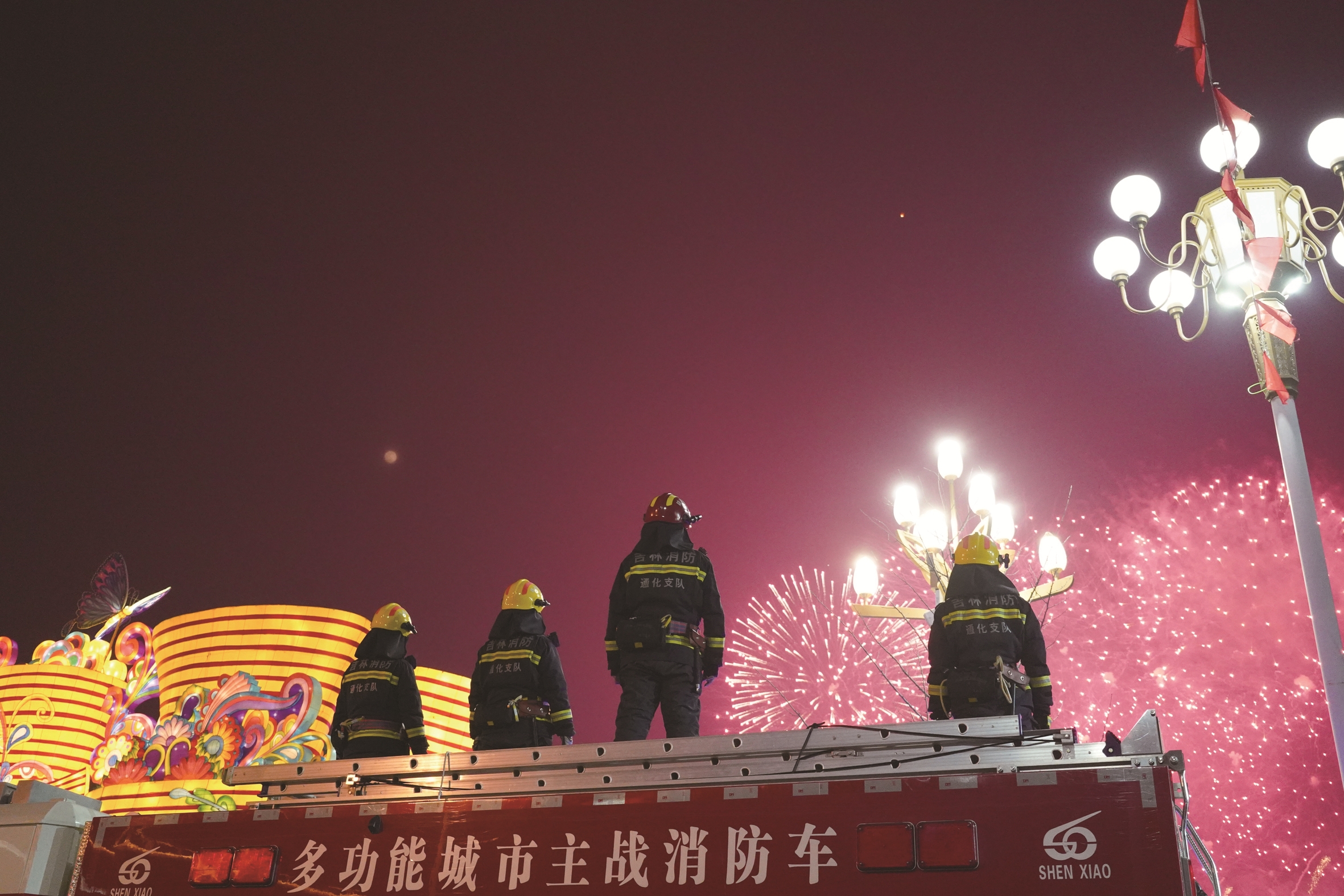 除夕夜,梅河口市消防救援大队在海龙湖烟花燃放点前置执勤。