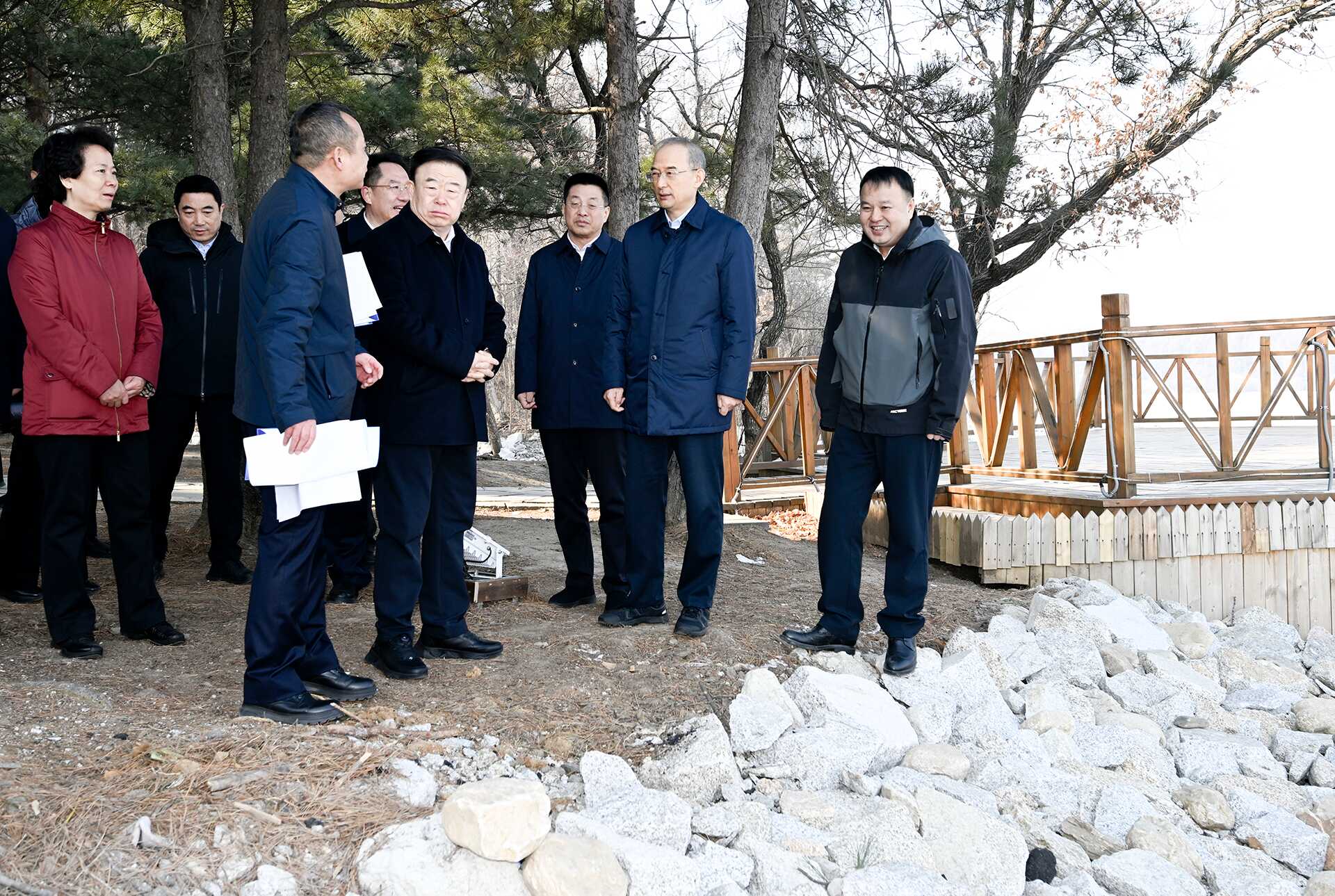 3月21日,省委书记黄强在长春净月潭国家森林公园调研,在森林浴场沿着湖岸实地察看土壤侵蚀、树木倒伏等情况。张野 摄