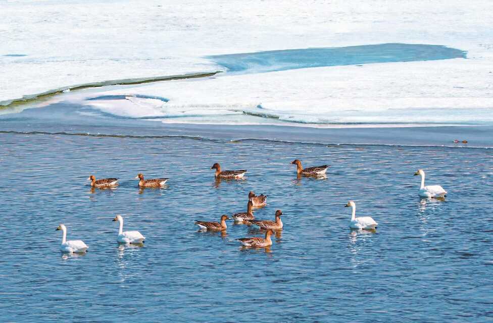 随着气温回升,白山市浑江区迎来了一群回迁的天鹅和大雁,在浑江水面上栖息觅食。生成志 李广友 摄