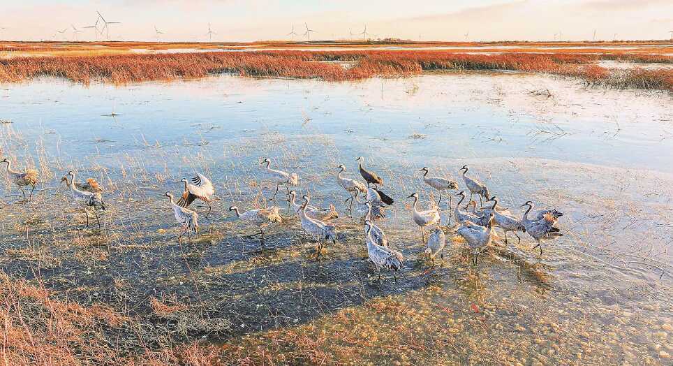 洮南市四海湖国家湿地公园成为候鸟栖息和繁衍的乐园,迁徙的候鸟数量逐年增加,种类已达200余种。图为白枕鹤正在湿地内觅食。邱会宁 范海辉 摄(资料图片)