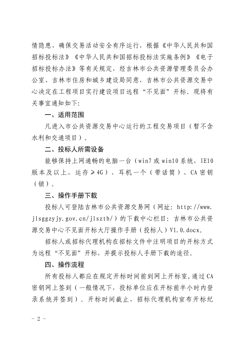 吉林市政务服务和数字化建设管理局 吉林市住房和城乡建设局关于公共资源交易网实行建设项目远程“不见面”开标的通知吉市政数局联发〔2020〕2号