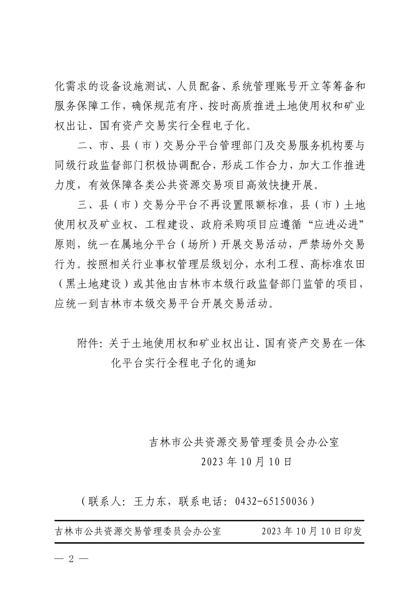 关于转发省政数局等部门《关于土地使用权和矿业权出让、国有资产交易在一体化平台实行全程电子化的通知》吉市公管办发〔2023〕4号