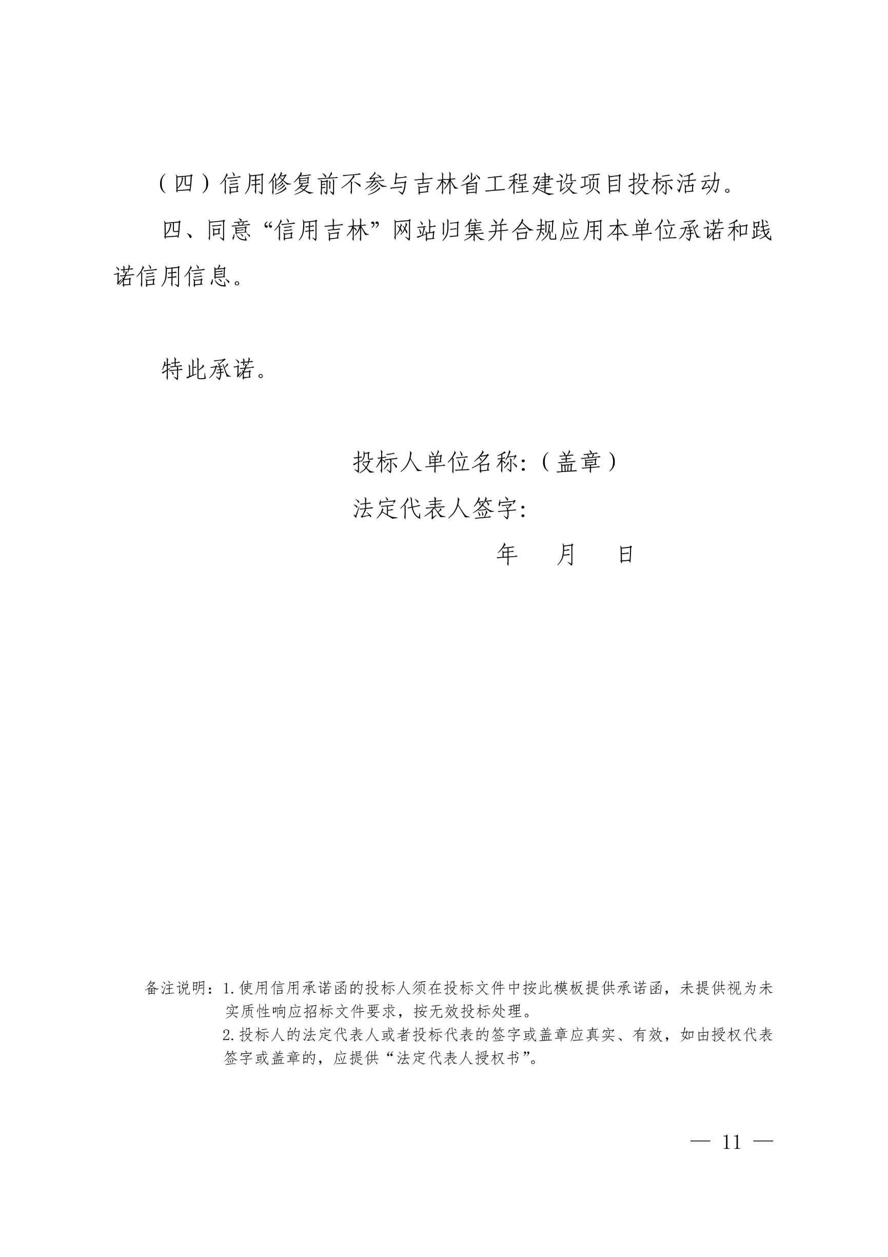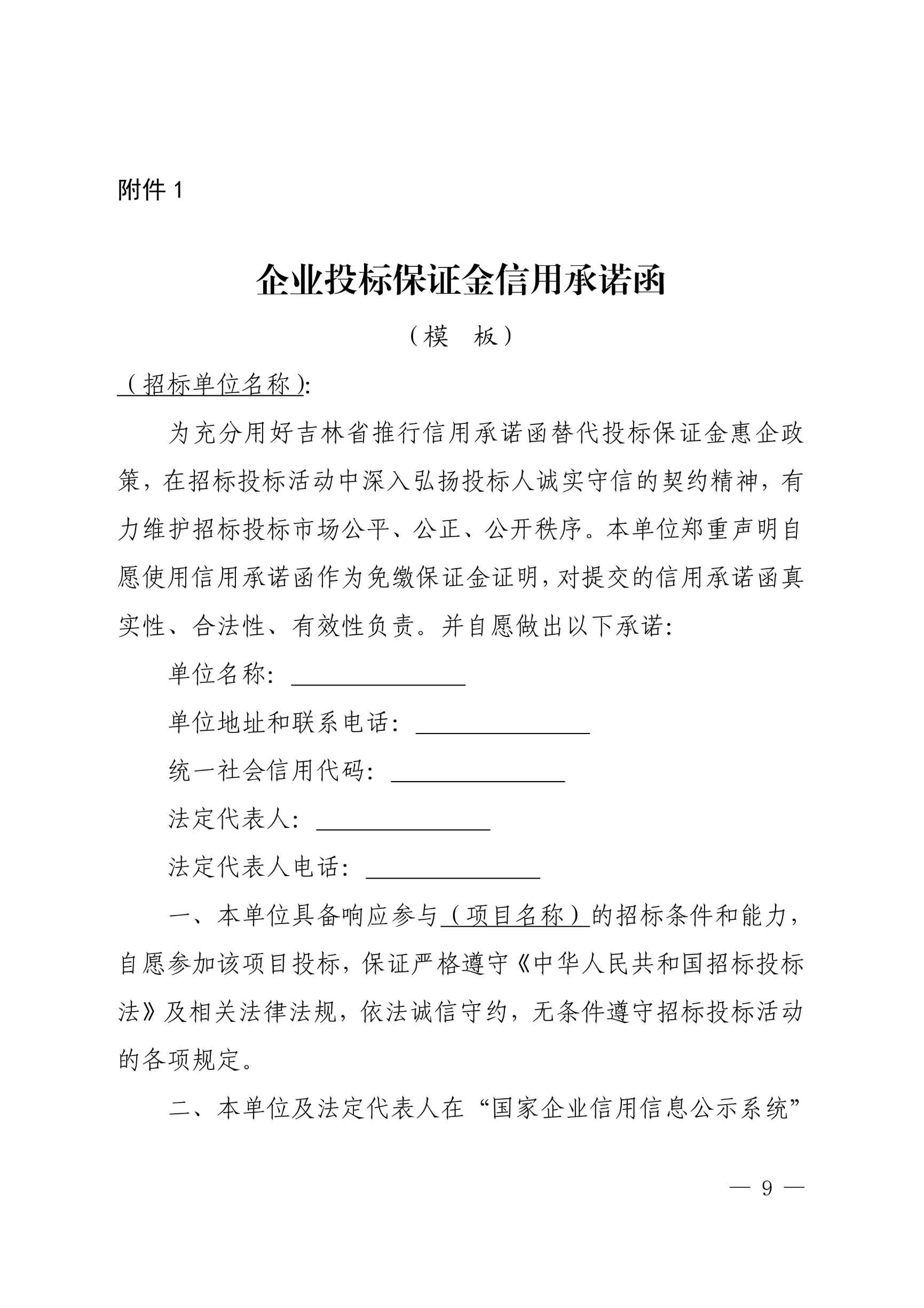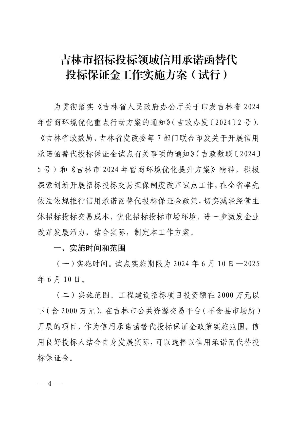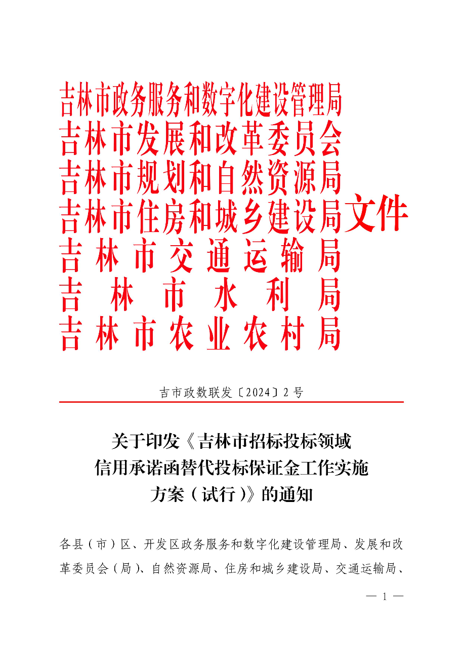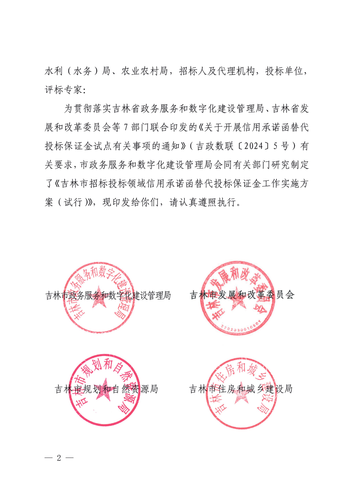 关于印发《吉林市招标投标领域信用承诺函替代投标保证金工作实施方案(试行)》的通知吉市政数联发〔2024〕2号