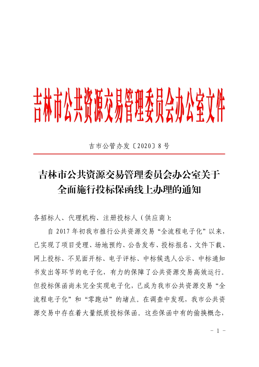 吉林市公共资源交易管理委员会办公室关于全面施行投标保函线上办理的通知吉市公管办发〔2020〕8号