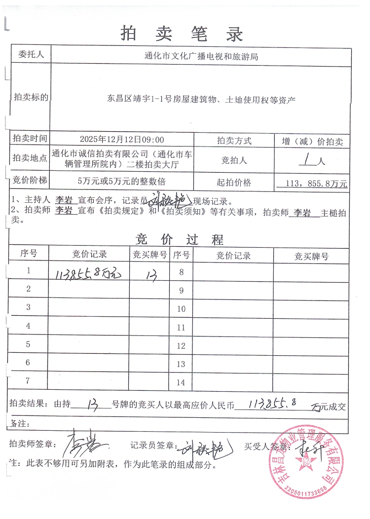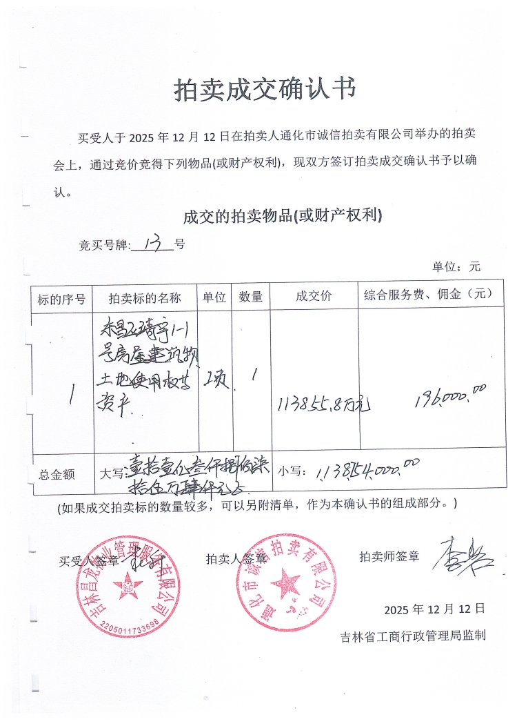 关于通化市文化广播电视和旅游局东昌区靖宇1-1号房屋建筑物、土地使用权等资产拍卖笔录及成交确认书的公示