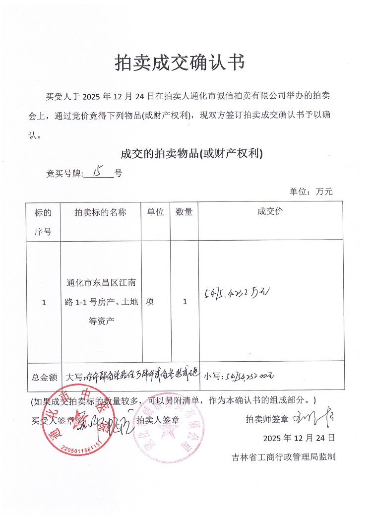 通化市东昌区江南路1-1号房产、土地等资产拍卖成交公示