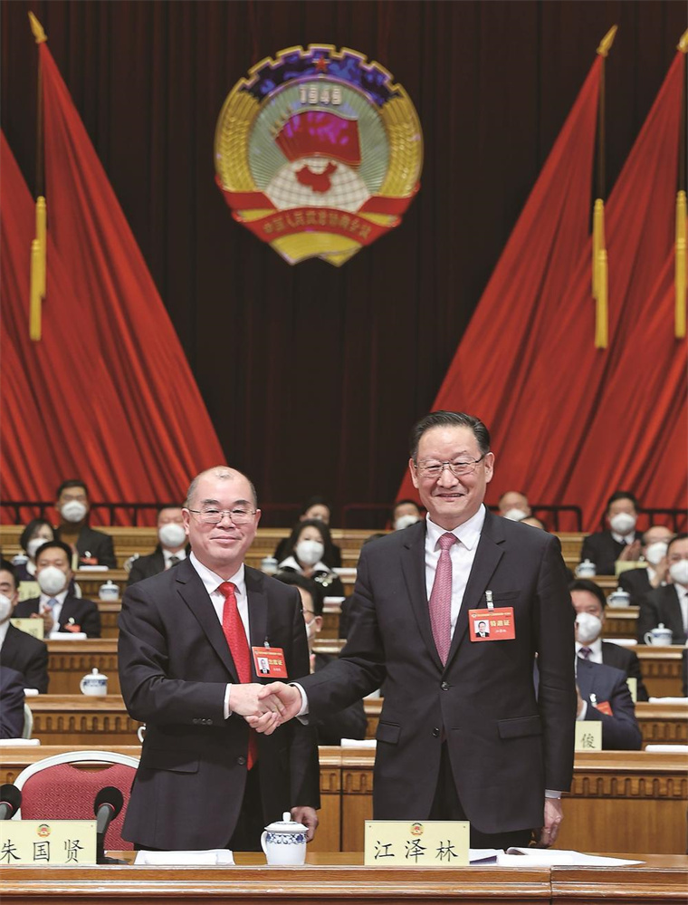 省政协十三届一次会议选举朱国贤为政协吉林省第十三届委员会主席,政协吉林省第十二届委员会主席江泽林同朱国贤热烈握手,表示祝贺。