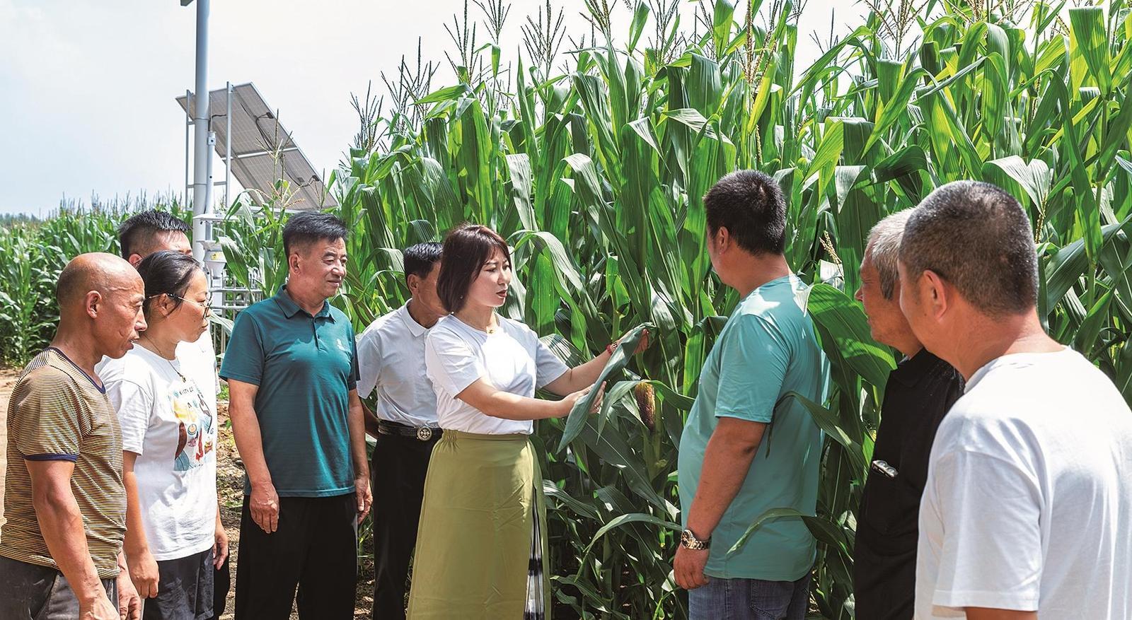 梨树县凤凰山农机农民专业合作社理事长韩凤香,和村民们查看玉米授粉和长势情况。高鸿 摄