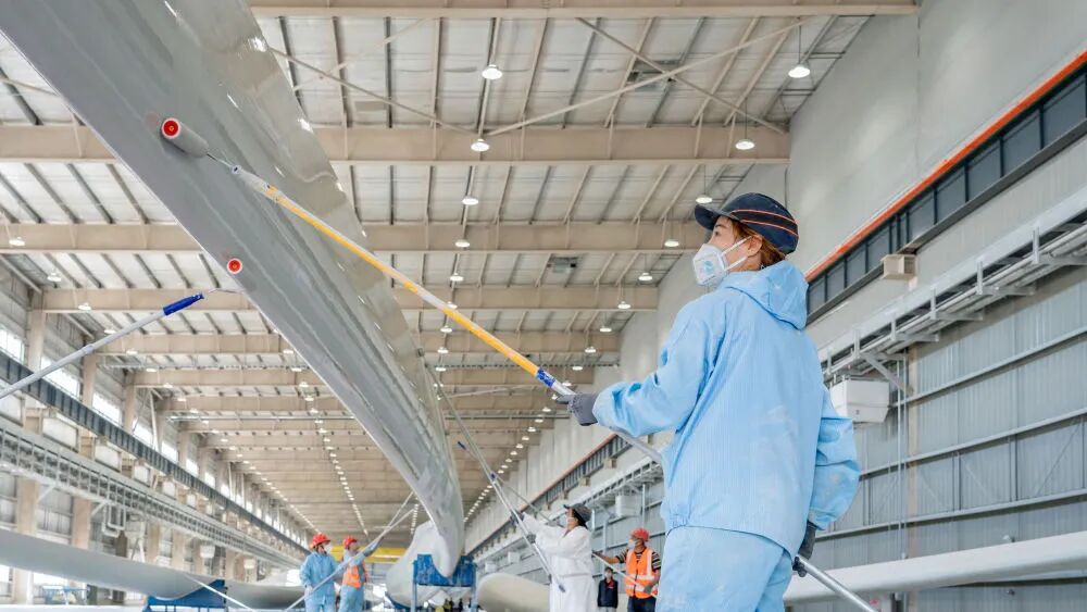 9月27日,吉林省洮南市上海电气洮南风电产业园内,工人正在涂装风机叶片。唐成卓 摄
